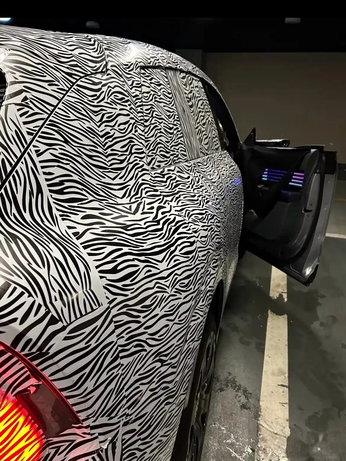 尾部的伪装虽然也很厚实,但依旧能看出新车配备了LED环形灯带,上方还有扰流板,运动感依旧不俗。